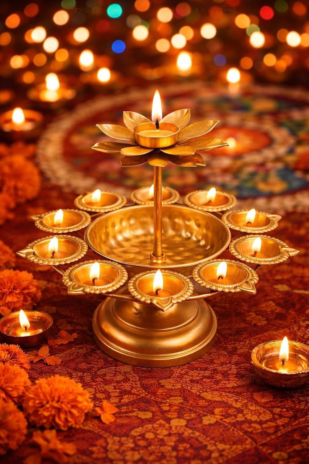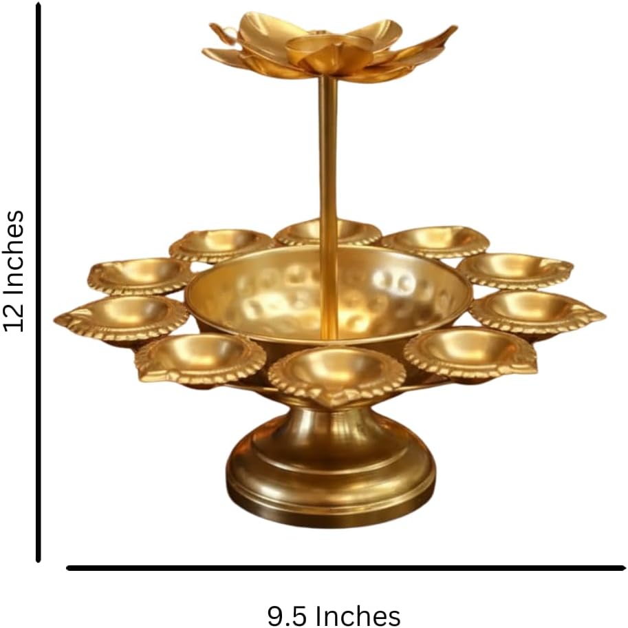 Features 9 evenly placed outer diyas surrounding a central raised lotus diya, creating a grand and symmetrical display of light.