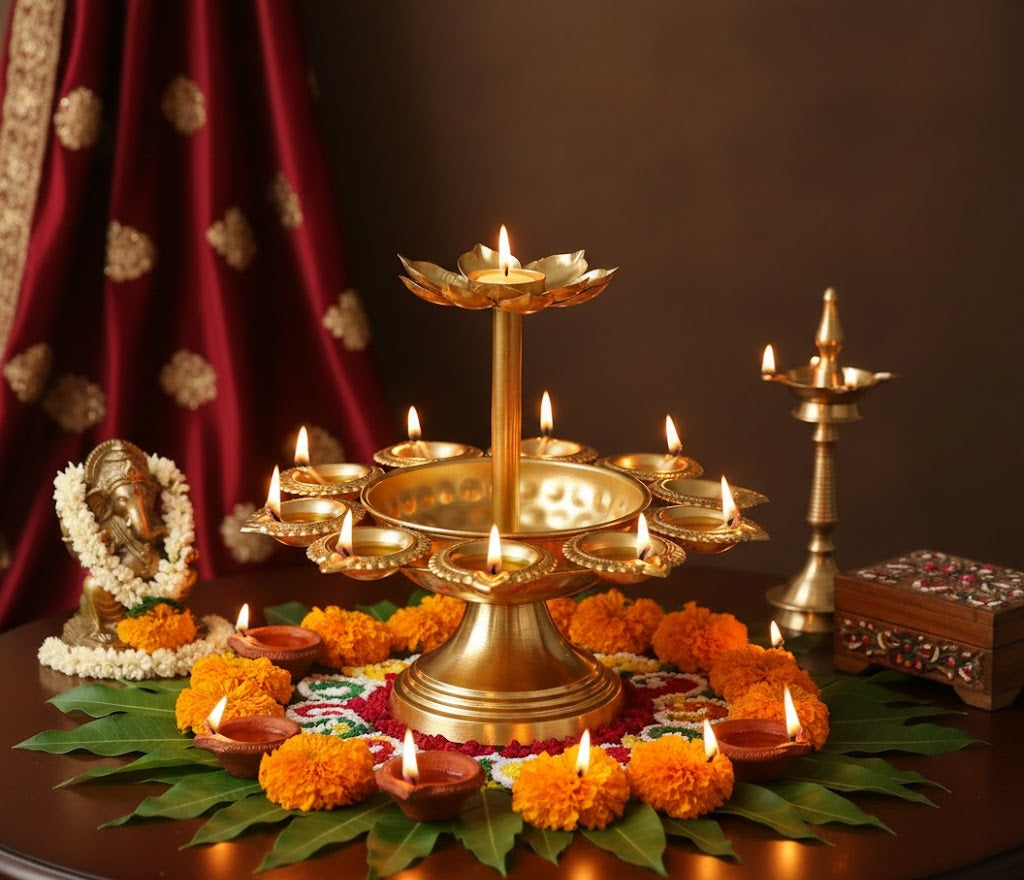 Multiple illuminated diyas provide a warm, radiant glow, enhancing the spiritual and peaceful atmosphere of your space.