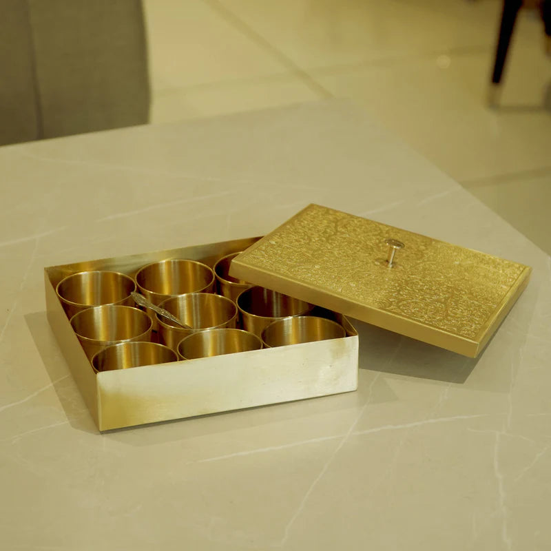 Brass is known for its natural antimicrobial properties, helping to keep spices fresh, aromatic, and hygienic. It helps lock in essential oils, preserves flavor for longer periods, and naturally repels insects, making it an ideal choice for daily spice storage. This masala box is eco-friendly, durable, and sustainable, offering a long-lasting alternative to plastic containers.