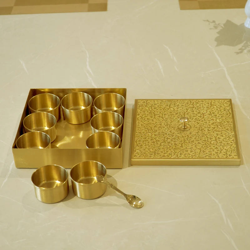 Elevate your kitchen with this Matte Finish Brass Square Masala Daani, a perfect blend of traditional craftsmanship and everyday functionality. Crafted from premium-quality brass, this spice box not only enhances the beauty of your kitchen but also offers several natural benefits for storing spices.