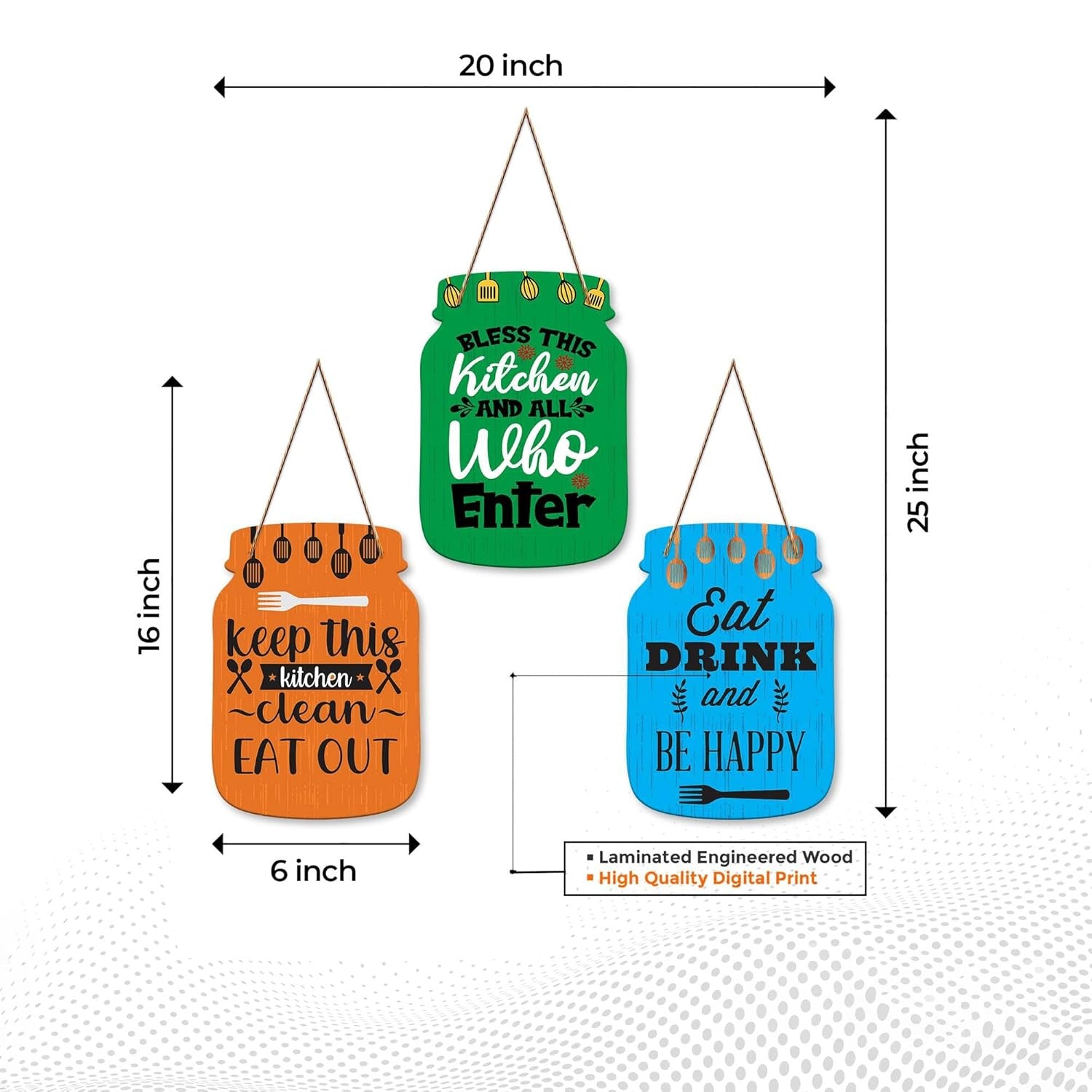 Handmade by skilled artisans using premium engineered wood, this set of three wall hangings blends durability with modern design—perfect for kitchens, dining areas, cafés, and gifting.