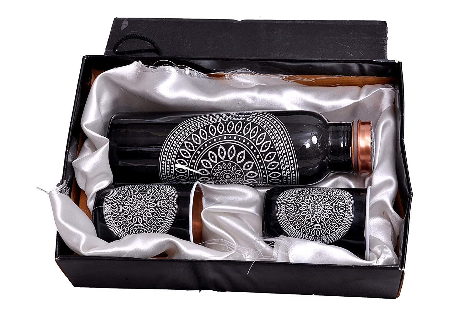 Present elegance, wellness, and tradition in one luxurious package with this Premium Black Copper Water Bottle Gift Set, beautifully packed in a high-end designer gift box. Crafted from 100% pure copper, the bottle and glasses feature a striking black exterior with intricate ethnic mandala-style artwork, while the interiors remain natural copper for authentic Ayurvedic benefits.