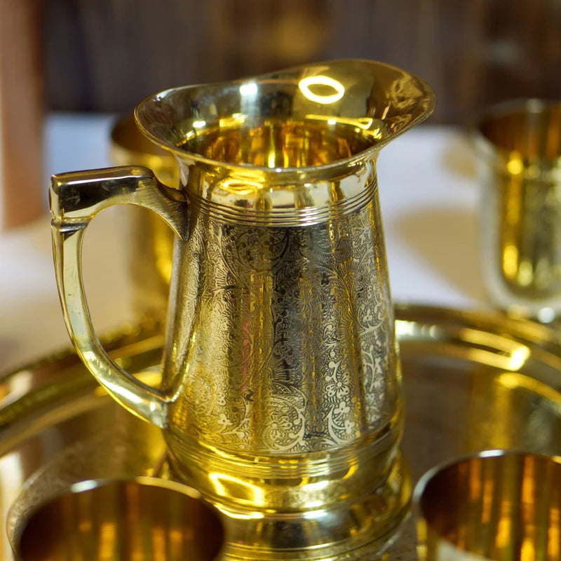 Enhance your home décor and serving experience with this Pure Brass Lemonade & Juice Jug Set with 6 Glasses and Tray. Designed with elegance and functionality in mind, this Brass Globe multifunctional lemon set features a lightly embossed edge and beautiful etched detailing on the tray base, making it a striking centrepiece for any occasion.